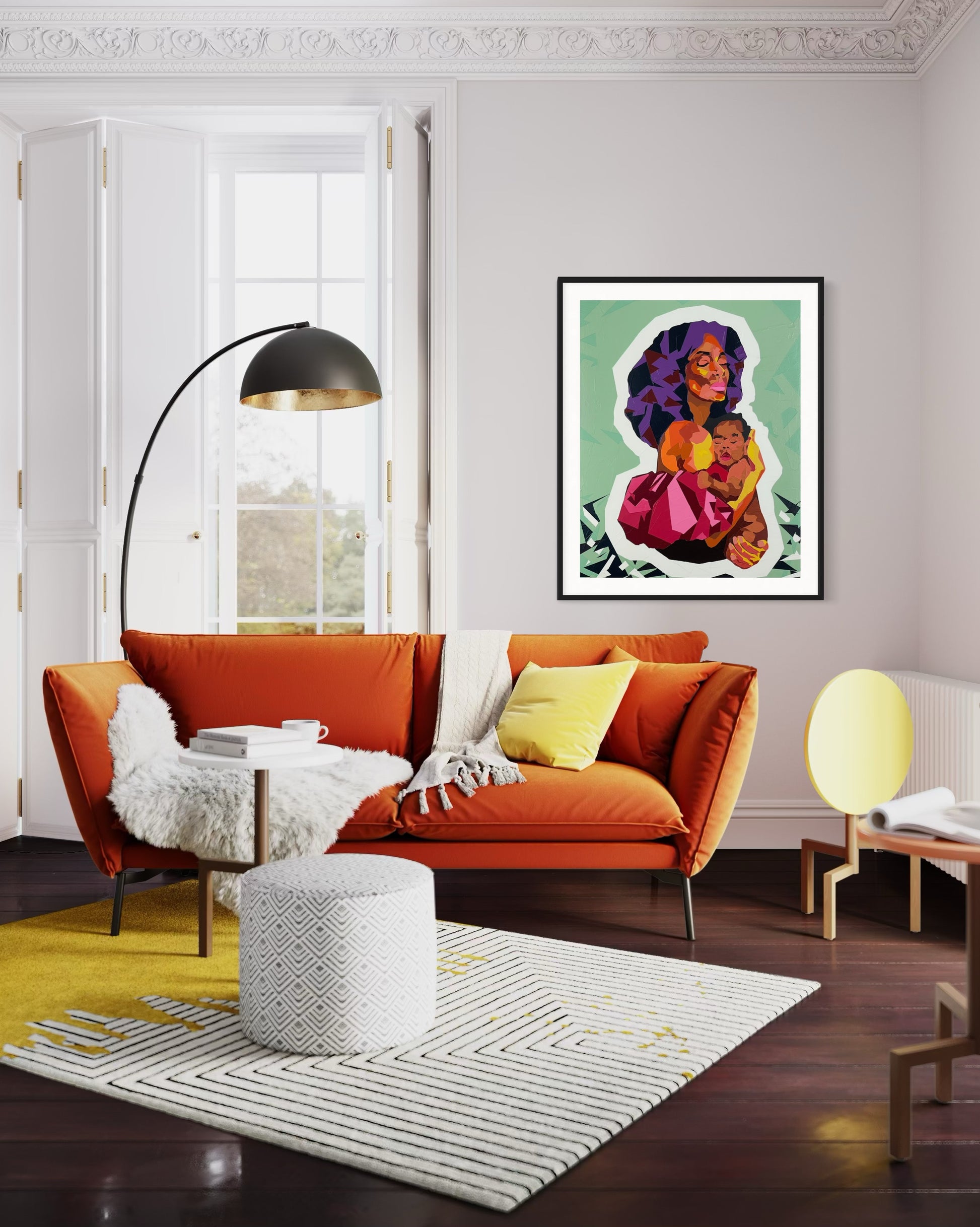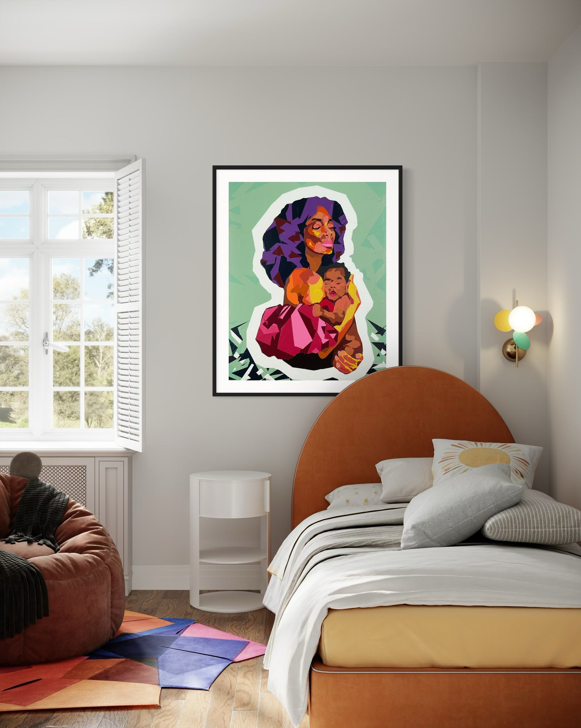Capture the essence of unconditional love and the beautiful connection between mother and child with our vibrant, colorful art print. This stunning piece depicts a mother holding her child in her arms, showcasing the powerful emotions of care, warmth, and protection. The lively, bold colors infuse the artwork with energy, symbolizing the joy and love that flows between them.